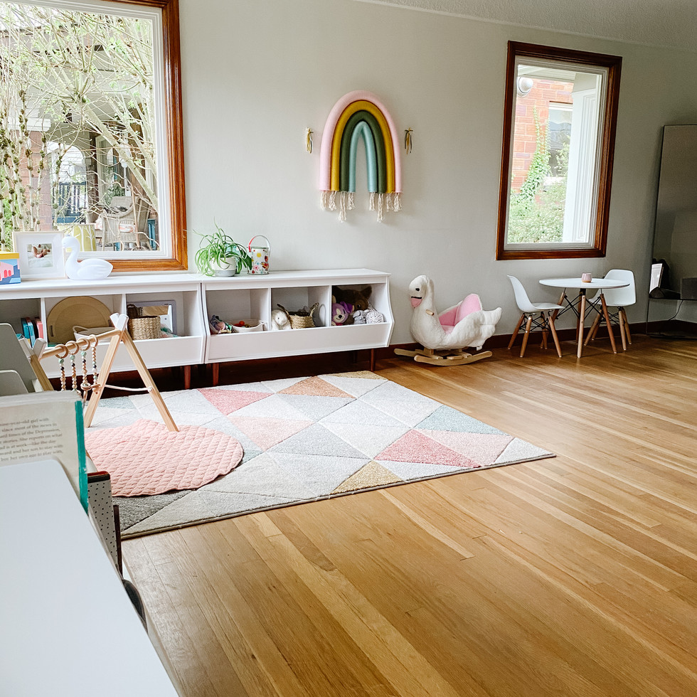 We coordinated the TV stand to match the play area furniture so it all felt like it was meant to be in the same room. The cute bookshelf stores all of our baby books and diaper changing supplies. We plan on converting it to an art supplies station once she's older. The toy bins are amazing, low enough for kids to pull everything out but adding baskets creates an illusion of organization because in reality everything is just tossed into the baskets! So easy! Because we have hardwood floors throughout our home, finding a rug for the play area was a must! We searched everywhere for an affordable, fun rug that coordinated with the rest of the living room. Eventually we'll add a play kitchen to this space but we couldn't help but buy the mcm table and chairs, they were too cute beneath this window!