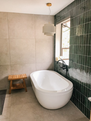 We love the transformation of the vanity area! The prior vanity had ineffective storage and an outdated look that our client wanted to simplify and update. Our client wanted a modern, minimalist look and this floating wood vanity nails it! The dramatic green tile really helps the warmth of the vanity stand out. We are obsessed with matte black hardware lately, but love that our client wasn't afraid of mixing metals, these gold light fixtures compliment the design so well. We've also found that floating vanities give the perception of a larger space because you can see the tile extend to the wall underneath the vanity. This extends your line sight and gives the appearance of a larger space.