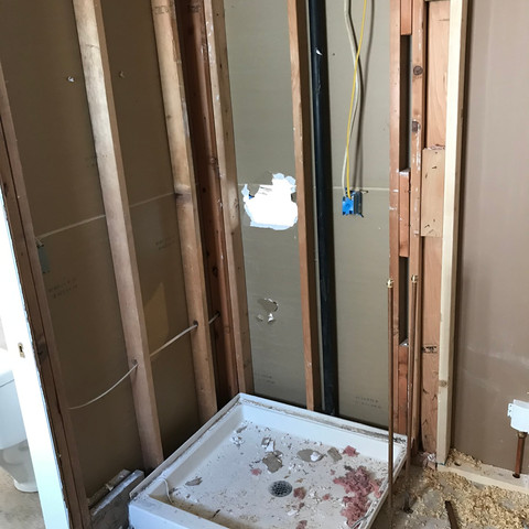 Arguably the trickiest part of this renovation; the master bathroom and laundry situation. The master bathroom was a jack and jill that led to the laundry hallway with backdoor access. Working with minimal space Theo had to come up with a way to create a larger master bathroom while still creating a practical laundry room. He borrowed space from the kitchen, closed off the jack and jill, and made the laundry more practical by straightening the hallway and using floor to ceiling cabinets and a stacked washer and dryer to maximize every inch of space! The shower was custom built to maximize the space and added unique features, such as the half shower wall, custom glass doors, river rock floor, rain shower, and slate tile walls with a bench.